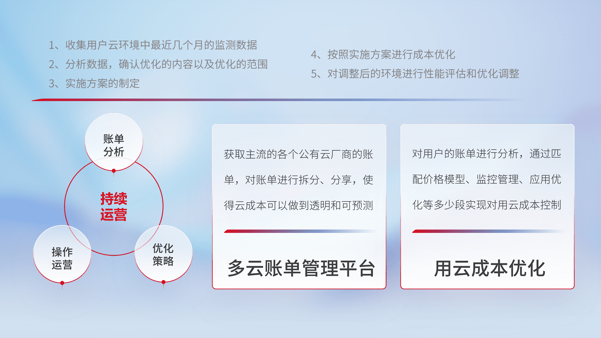 通过多云纳管,,以统一的资源数据模型把客户的云资源进行抽象和封装,,进而实现对多云资源的统一操作,,保障云资源管理的可靠性、、、、稳定性与可用性。。。。量身定制化运维内容,,,,配置、、、开发运维、、、、补丁管理、、备份、、、监控、、认证和访问管理、、、审计和日常巡检等,,,保障在用云过程中的可靠度,,稳定度以及高可用率。。。