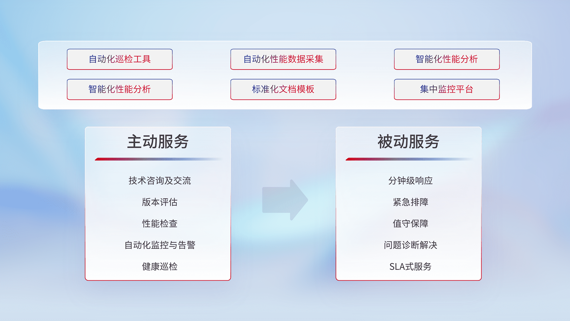 智能化工具和标准化文档,,,保障服务质量,,,,提供主动服务(包含技术咨询、、、版本评估、、、性能检查、、、、自动化监控与告警、、、健康巡检)和被动服务包含(分钟级响应、、、、紧急排障、、值守保障、、、问题诊断解决、、SLA服务)。。。