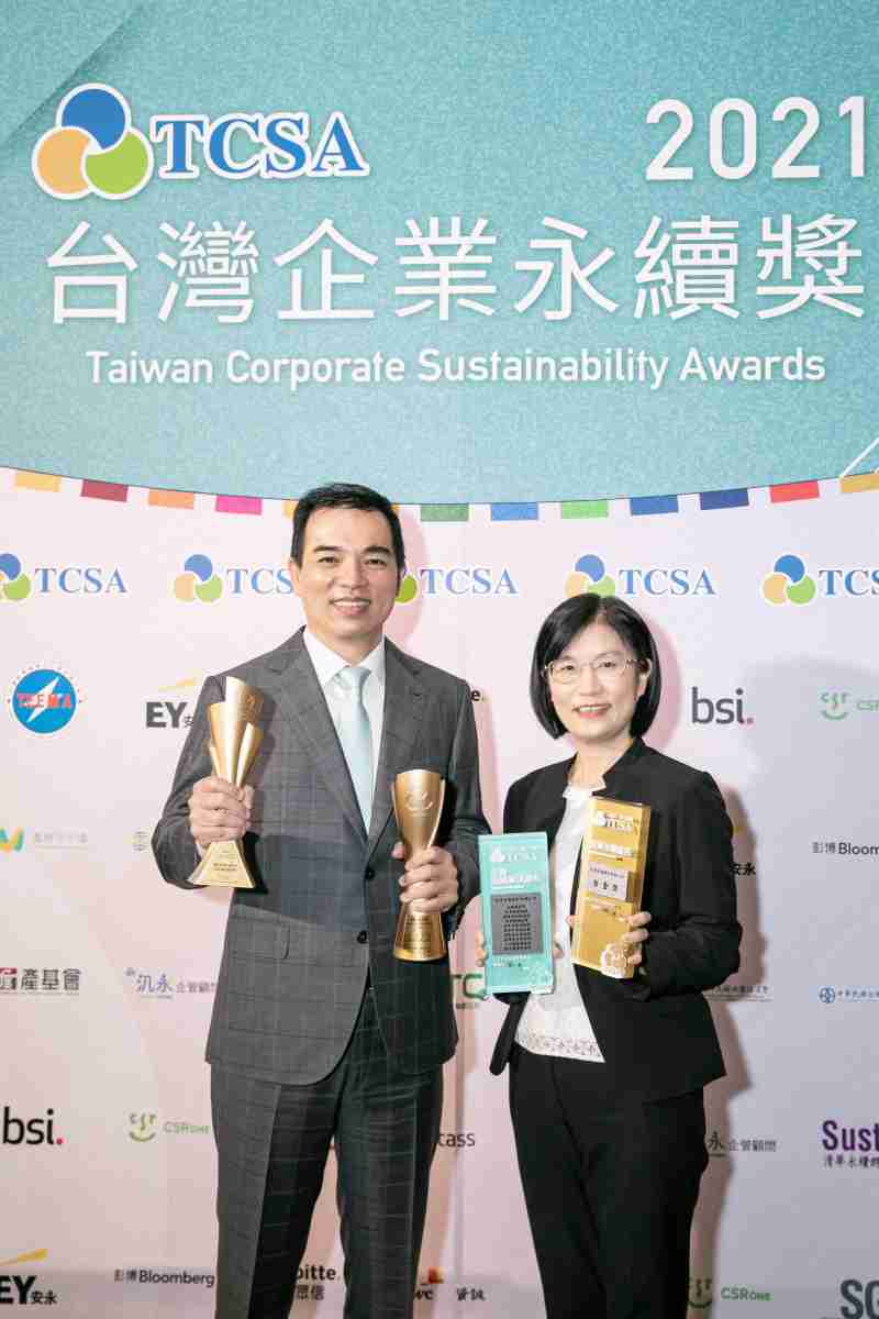 达在台湾永续奖所评比环境、、、、社会、、、、治理等各面向的永续绩效均获高度肯定 (左:彩霸王光电总经理暨营运长柯富仁,,,,右:彩霸王光电永续长古秀华)