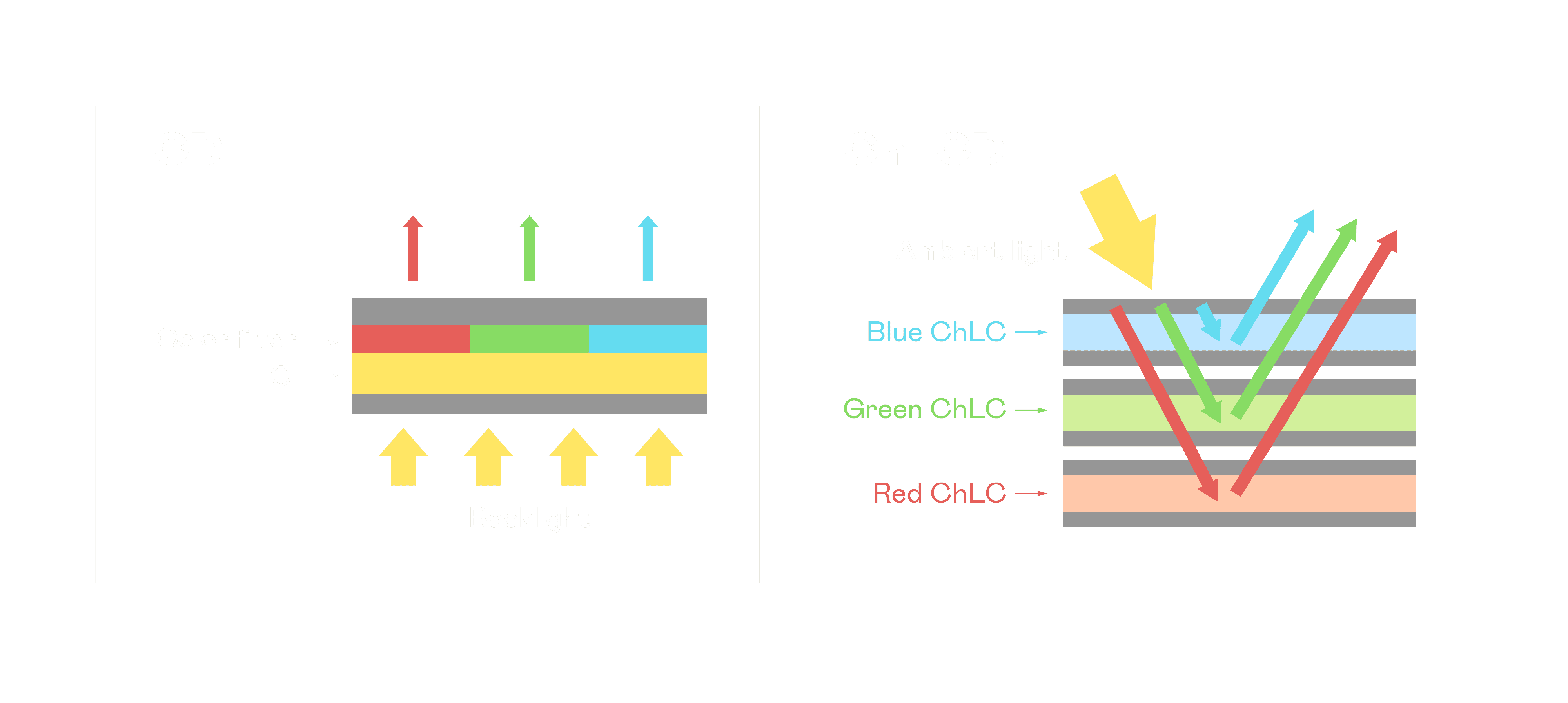 ChLCD 胆固醇液晶就如同纸张一样,,透过反射环境光来显示影像,,,,因此长时间观看不易造成人眼视觉疲劳,,可达到护眼效果。。当处于户外阳光下使用,,LCD 影像容易失真而不易观看,,,,但胆固醇液晶仍可维持较佳的影像品质。。。